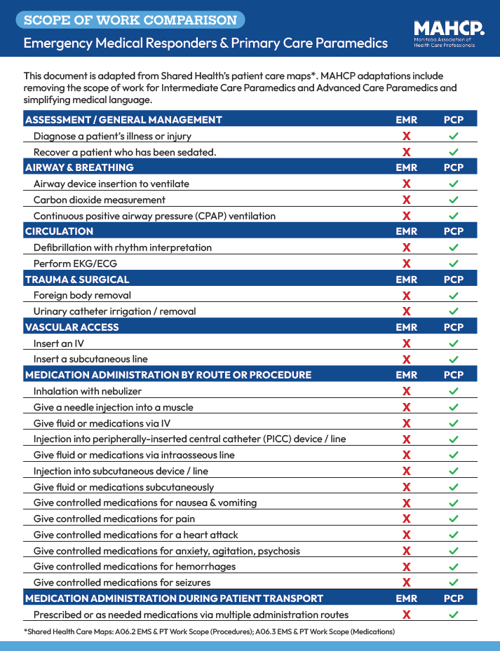 Let’s be clear: MAHCP is not advocating against EMRs. They play an important role in EMS. We’re advocating for solutions designed to protect patients, reduce paramedic burnout, and support a fully-trained paramedic workforce that can deliver emergency care at the highest standard — the standard the province once committed to. So far, Shared Health and the Province have not implemented any of the common-sense and cost-effective solutions MAHCP has put forward.