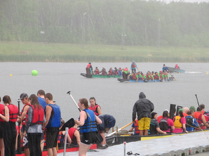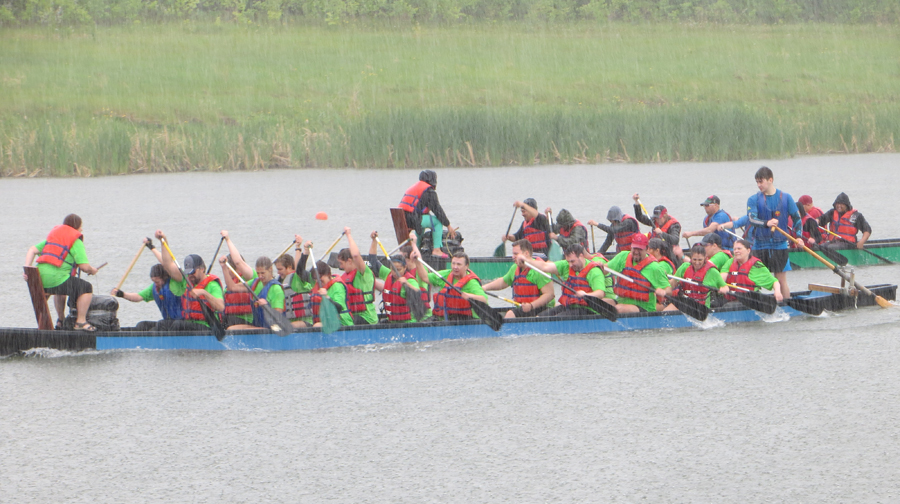 The Conquer-Oars battled the elements as well as their competitors! Friday evening’s race was during a beautiful setting of the sun, but Saturday morning’s race was a soggy affair. By the afternoon on Saturday, the weather had settled somewhat down. (Pictures by Quinn Moroz and Bernice Pontanilla)